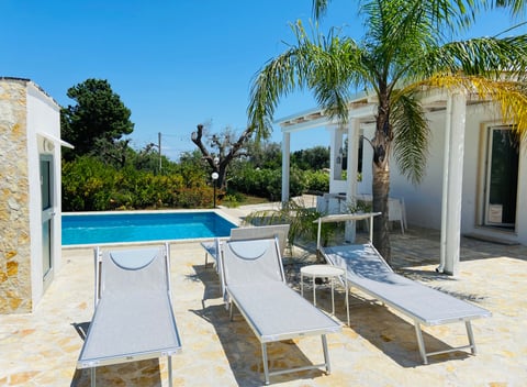 Ontdek Puglia, het Toscane van het zuiden! Dit natuurhuisje ligt centraal in Puglia; 15 kilometer van het vliegveld Brindisi, twee kilometer van het levendige centrum van San Vito dei Normanni en vijf kilometer van het zandstrand van natuurreservaat Torre Guacato. Zittend bij het zwembad en omgeven door een omheinde tuin van 2000 m² met olijf- en citroenbomen, druiven, vijgen en cactussen kun je in alle rust genieten van de pure mediterrane sfeer. Dit natuurhuisje is ingericht voor zes personen en geheel gelijkvloers. Vanuit de centrale gang heb je toegang tot de drie slaapkamers, woonkamer, keuken, badkamer en garage. Buiten is een veranda en bij het zwembad van 5 x 10 meter vind je een overdekt terras, extra douche en wc.