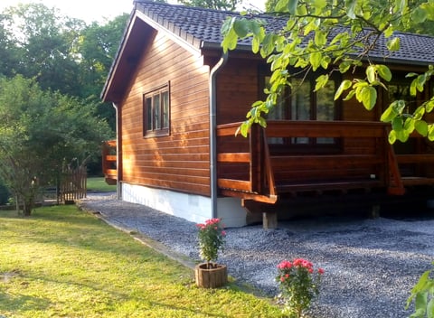 Dit natuurhuisje biedt plaats aan vijf personen + één extra klapbed en ligt in een ruim, omheind domein van 2000 m² te midden van een oase van groen en rust, met voldoende privacy, waar bovendien ook je trouwe viervoeters welkom zijn. Dus huisdieren kunnen niet weg. Een pluspunt aan dit huisje is dat het niet op een vakantiepark of chaletpark gelegen is. Het natuurhuisje is volledig gerenoveerd en voorzien van nieuw, modern, teakhouten meubilair. Het huis beschikt over een ruime living, twee slaapkamers, één badkamer met inloopdouche apart toilet en een ingerichte keuken met oven, microgolf , koelkast, diepvries, eetplaats en een zithoek. Het is overal voorzien van centrale verwarming. Er is digitale televisie aanwezig en ook WiFi. In dit huisje is een vaatwas- & wasmachine aanwezig, alsook nieuwe bedden met nieuwe matrassen en frisse kussens en dekbedden. Op mooie dagen is het buiten volop genieten op het zonnige terras met bijhorende tuinset en zes ligbedden. Er is ook een barbecue.