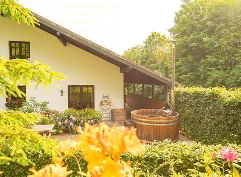 De tuin gaat direct over in een eindeloos bosgebied met fiets- en wandelroutes vanaf het huis. Er is een groot omheind terras op het zuiden met ofyr-Grill waar het hele jaar door gegrild kan worden. Op het achterterras bevinden zich de houtgestookte hottub en de Finse sauna. Verder zijn er nog een speeltuin voor de kleintjes, een vuurplaats en een sportveldje voor voetbal/basketbal/volleybal. Dit sportveldje dient ook als afsluitbare motorparking.Het natuurpark Hoge Venen-Eifel is een paradijs voor alle buitensporters. Ons vakantiehuis staat in het middelpunt van een groot netwerk met bewegwijzerde routes voor wandelaars, mountainbikers, wielrenners, trailrunners en motorrijders. De ruime fietsenkelder, de bikewash en de droogkamer zijn optimaal voor sportieve groepen. We voorzien u graag van kant-en-klare routes, tips en kaartmateriaal.