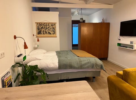 Nieuw! Voormalige werkruimte gerenoveerd tot gezellig, modern ‘tiny house’, met een vleugje vintage. Gelegen in de tuin van eigenaar/kunstenaar-docent, aan een rustig wandelpaadje midden in het prachtige Heuvelland van Zuid-Limburg. Het huisje biedt voldoende ruimte voor 2 personen en ligt afgescheiden voor voldoende privacy. Vanaf uw privé-terras heeft u een vrij uitzicht over de weilanden, met ondergaande zon aan de horizon, waar de dorpskern van Banholt ligt. Hier wandelt u in 5 à 10 minuten naartoe, langs de schapen en paarden. Voor de koudere dagen is de pelletkachel gevuld. Ook kunt u zowel verwarmen als koelen met de aanwezige stille split-airco. Er is TV incl. Netflix. Beddengoed, handdoeken, keukenlinnen, föhn aanwezig. De koelkast heeft geen vriesvak. Onze enthousiaste pup Sammy zal u willen begroeten, maar kan niet op uw terras (tenzij u dat gezellig vindt). Het kattenluikje is nu de ‘afzuigflap’.